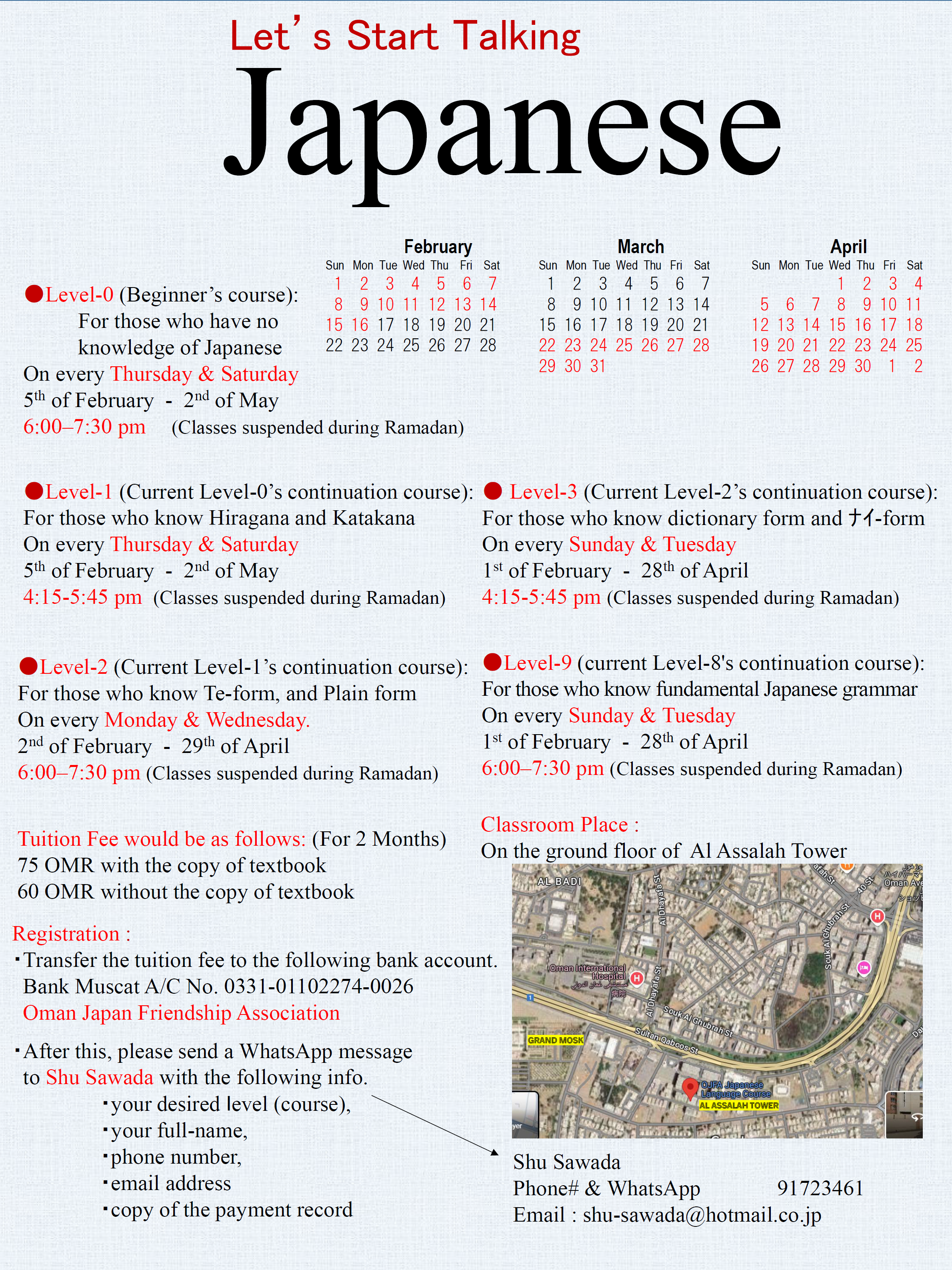 Mr. SAWADA Shuichi (Instructor): shu-sawada@hotmail.co.jp / Tel. & WhatsApp +968-9172-3461